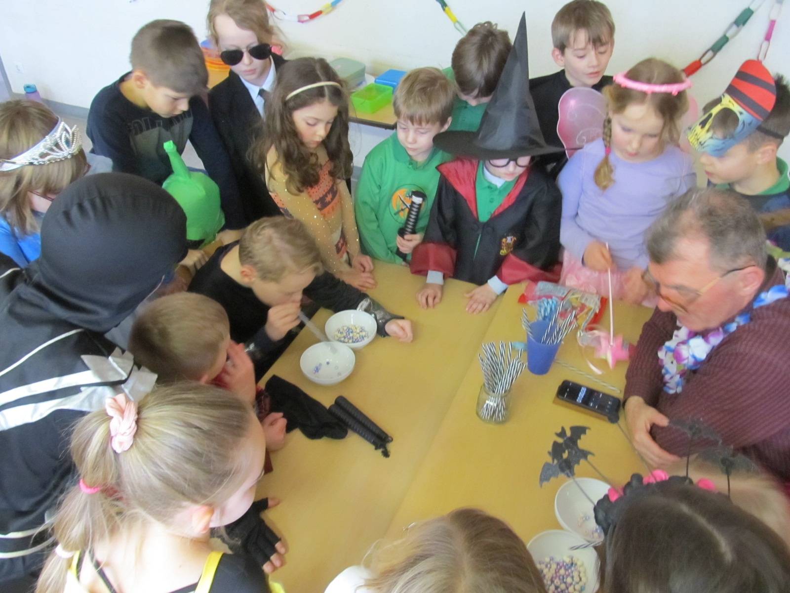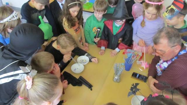 Natürlich gab es nicht nur den einen Höhepunkt an diesem Tag - mit stimmungsvoller Musik wechselten all unsere Prinzessinnen, Ritter, Feen, Cowboys, Hexen, Vertreter aus Star Wars, Katzen usw. von den Zuschauerplätzen an die Faschingsstationen. Und da konnte man sowohl seine Geschicklichkeit und Schnelligkeit als auch sein künstlerisches Talent unter Beweis stellen. Es wurde gelaufen, gespielt und gebastelt. Wer hier erfolgreich war, konnte sich sogar den Bauch mit - mmh lecker - Süßigkeiten vollstopfen. Und wer bis dahin noch nicht kleinzukriegen war, der konnte sich bei der Disco so richtig auslassen.