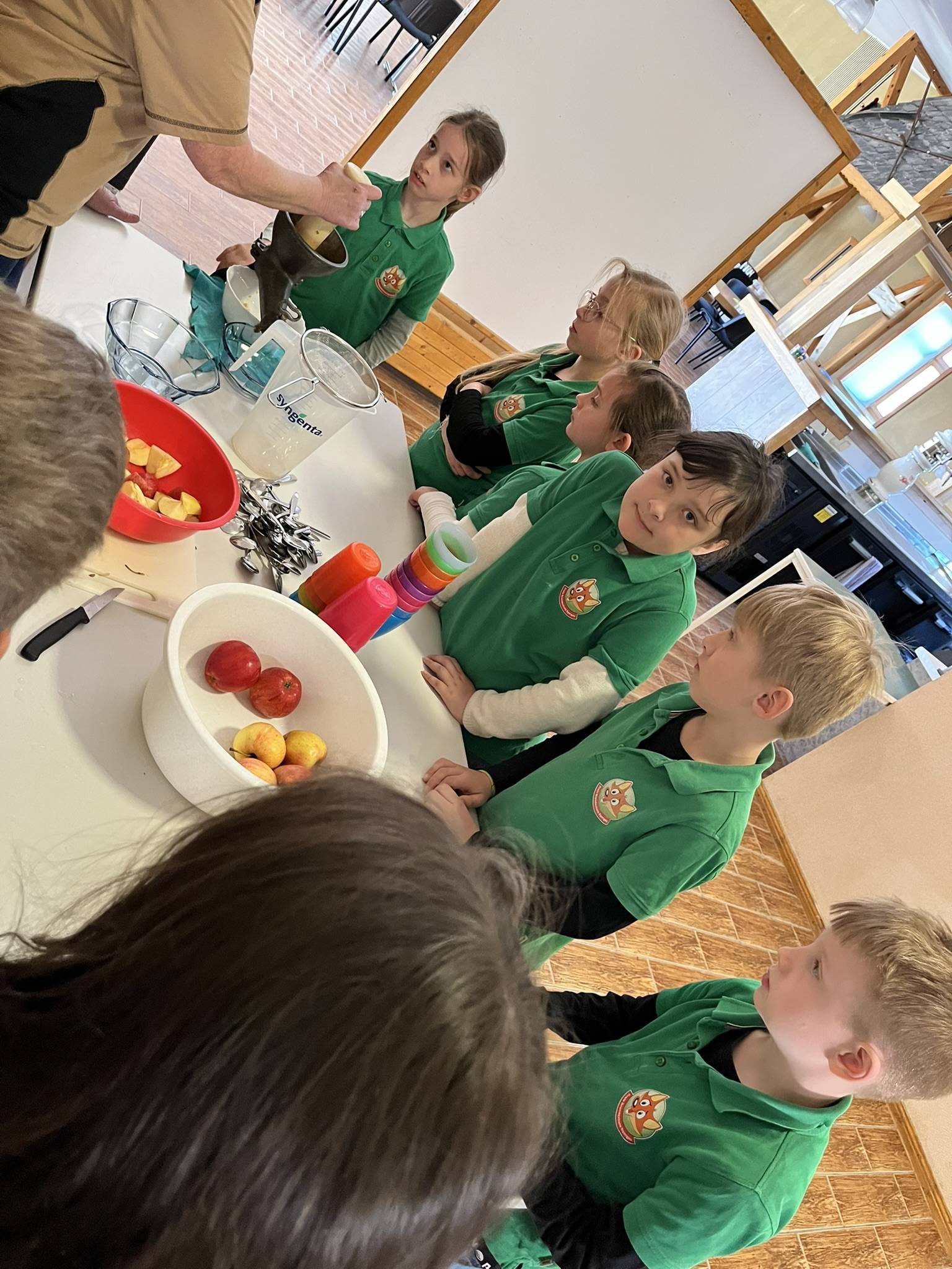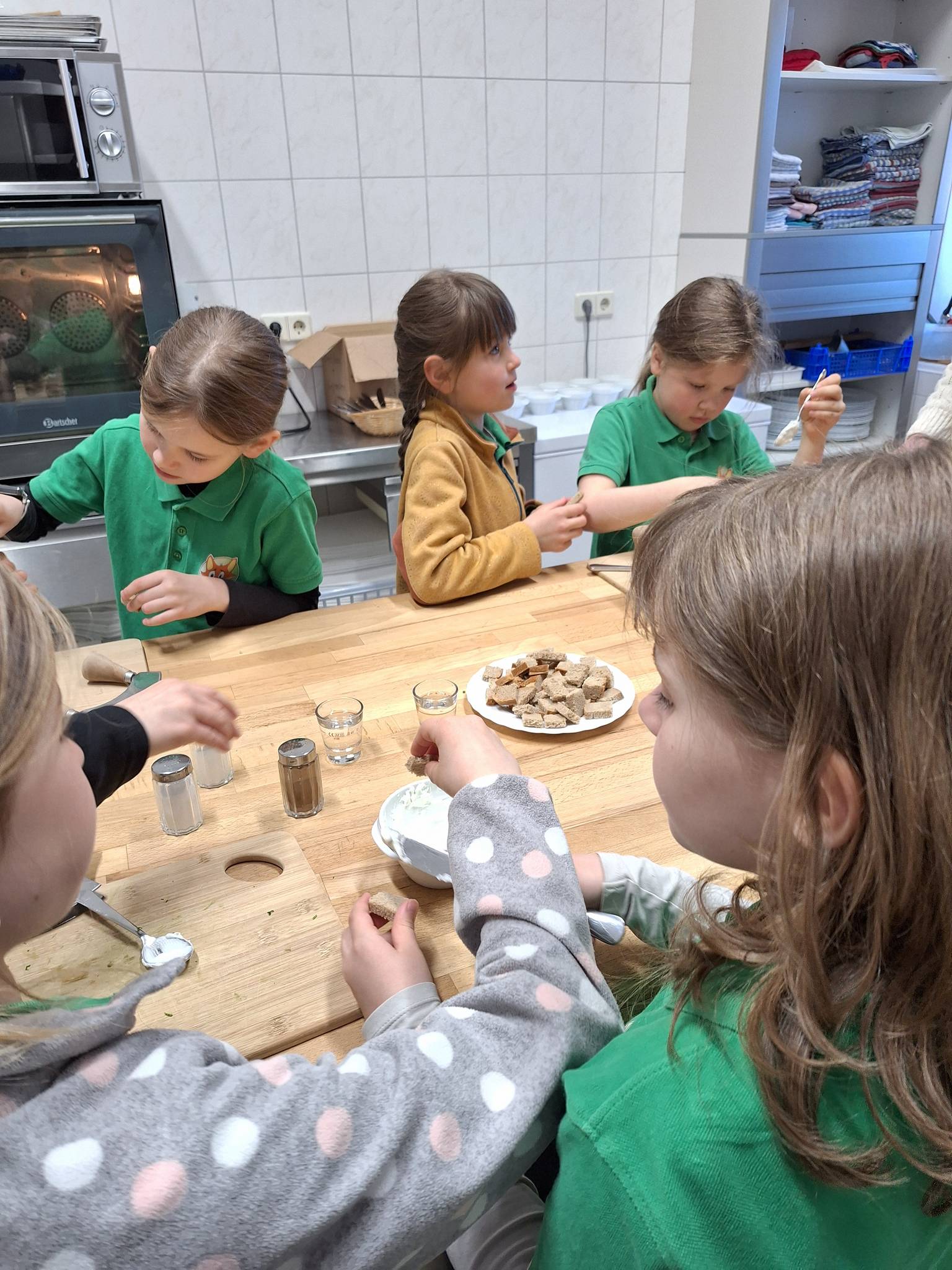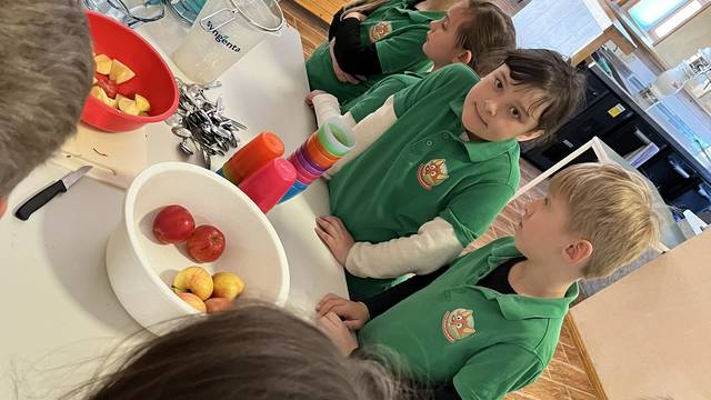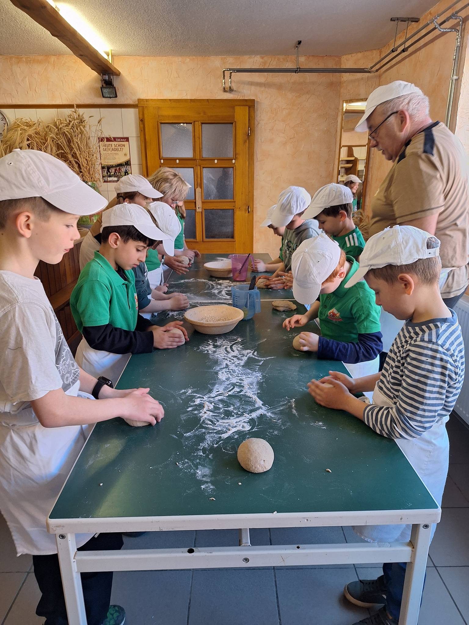 Wir, die 2. Klassen, waren am 8.4.2026 auf dem Wünscher Landhof. Dort haben wir Apfelsaft ausgepresst. Die Äpfel waren so gut, dass wir sogar Apfelmus kosten konnten. Dann haben wir Kräuterquark gemacht. Wir haben mit einem Wiegemesser Kräuter kleingeschnitten und in den Quark gelegt und umgerührt. Dann waren wir beim Bäcker, und haben leckeres Brot gebacken. Wir sollten viermal den Teig umschlagen, dann mit einem Pinsel Wasser aufgetragen. Wir konnten mit Haferflocken unser Brot verzieren. Vorher haben wir sogar gelernt, wie verschiedene Getreidesorten heißen, und die 5 Zutaten: