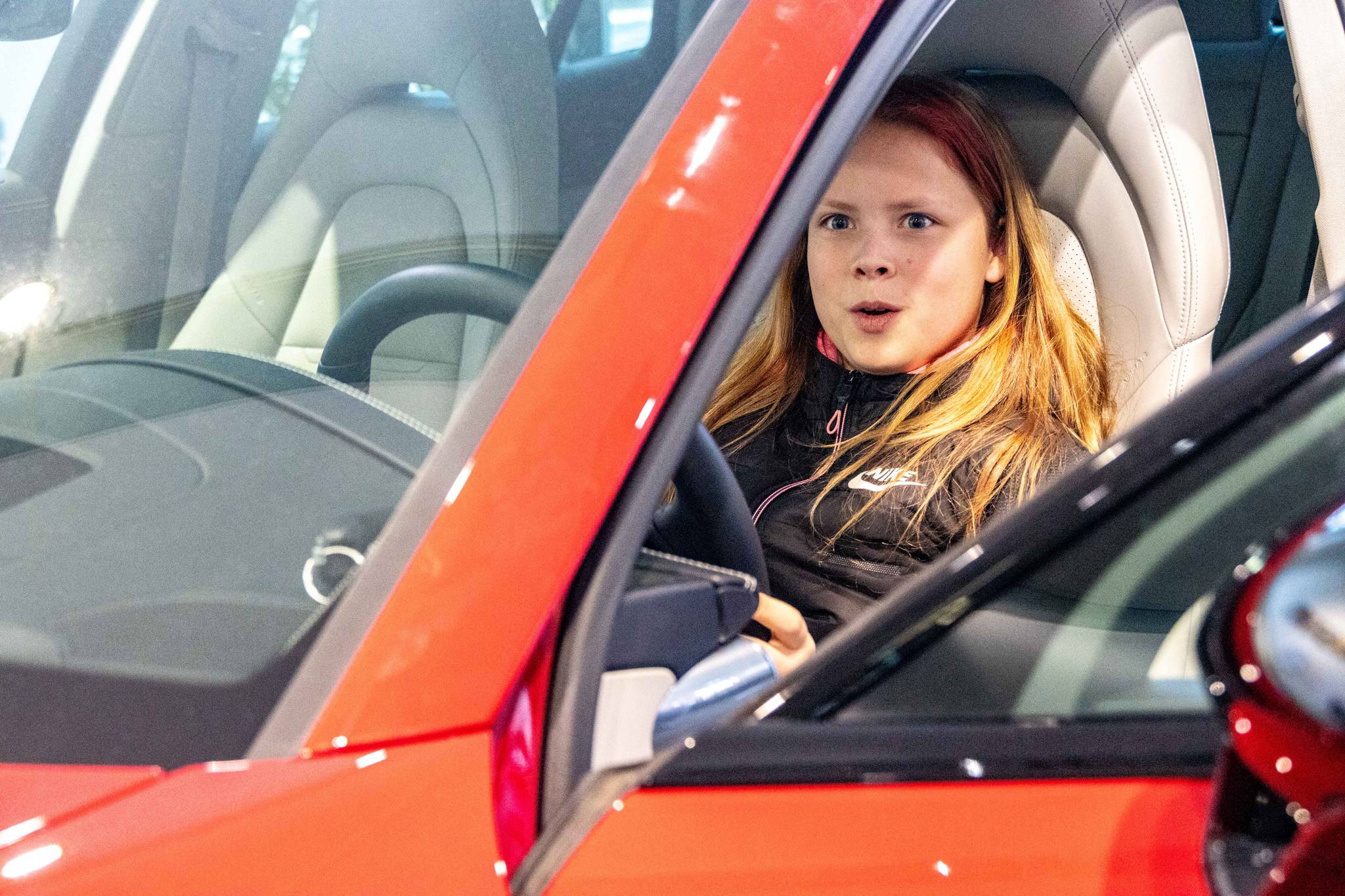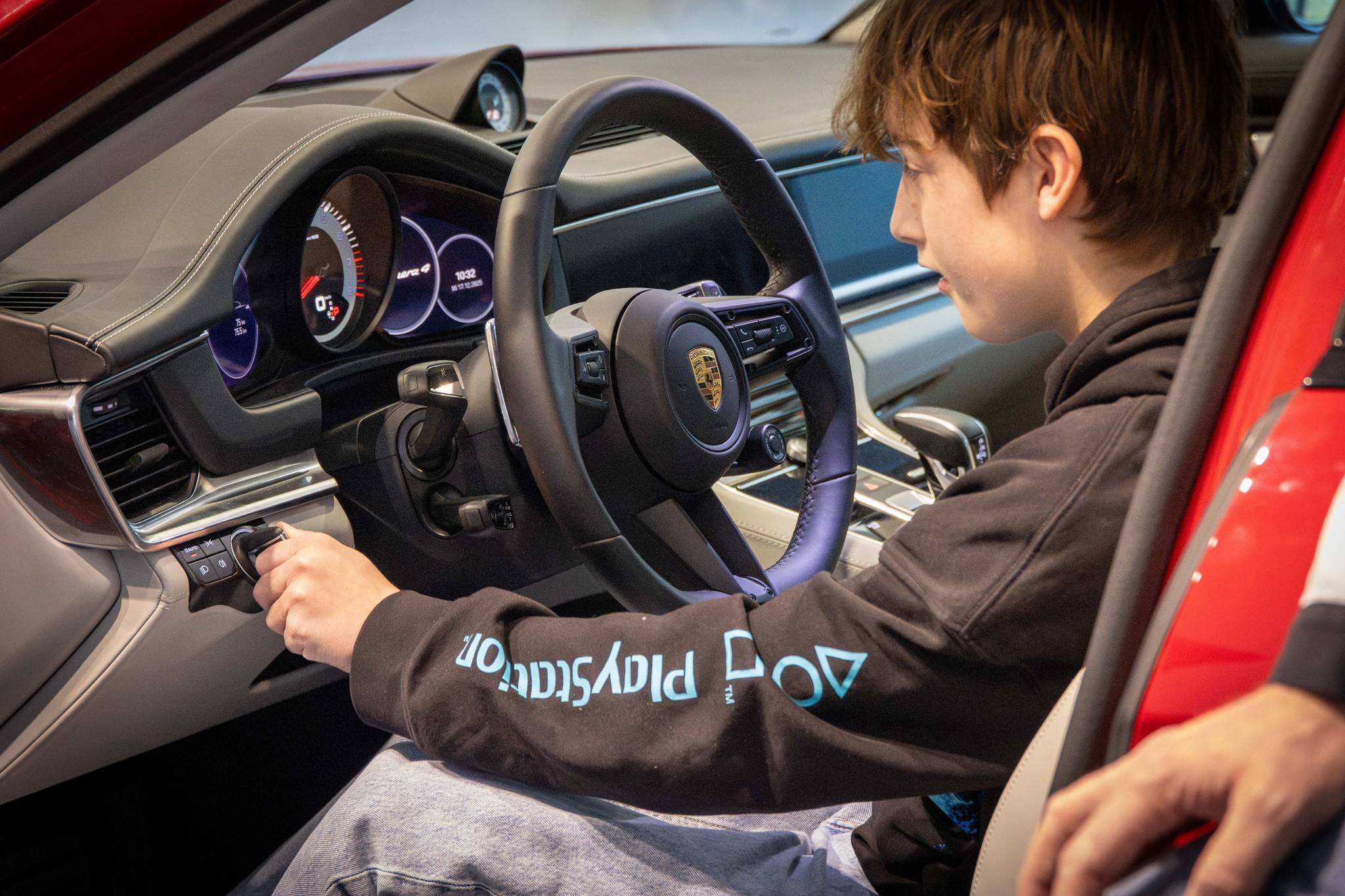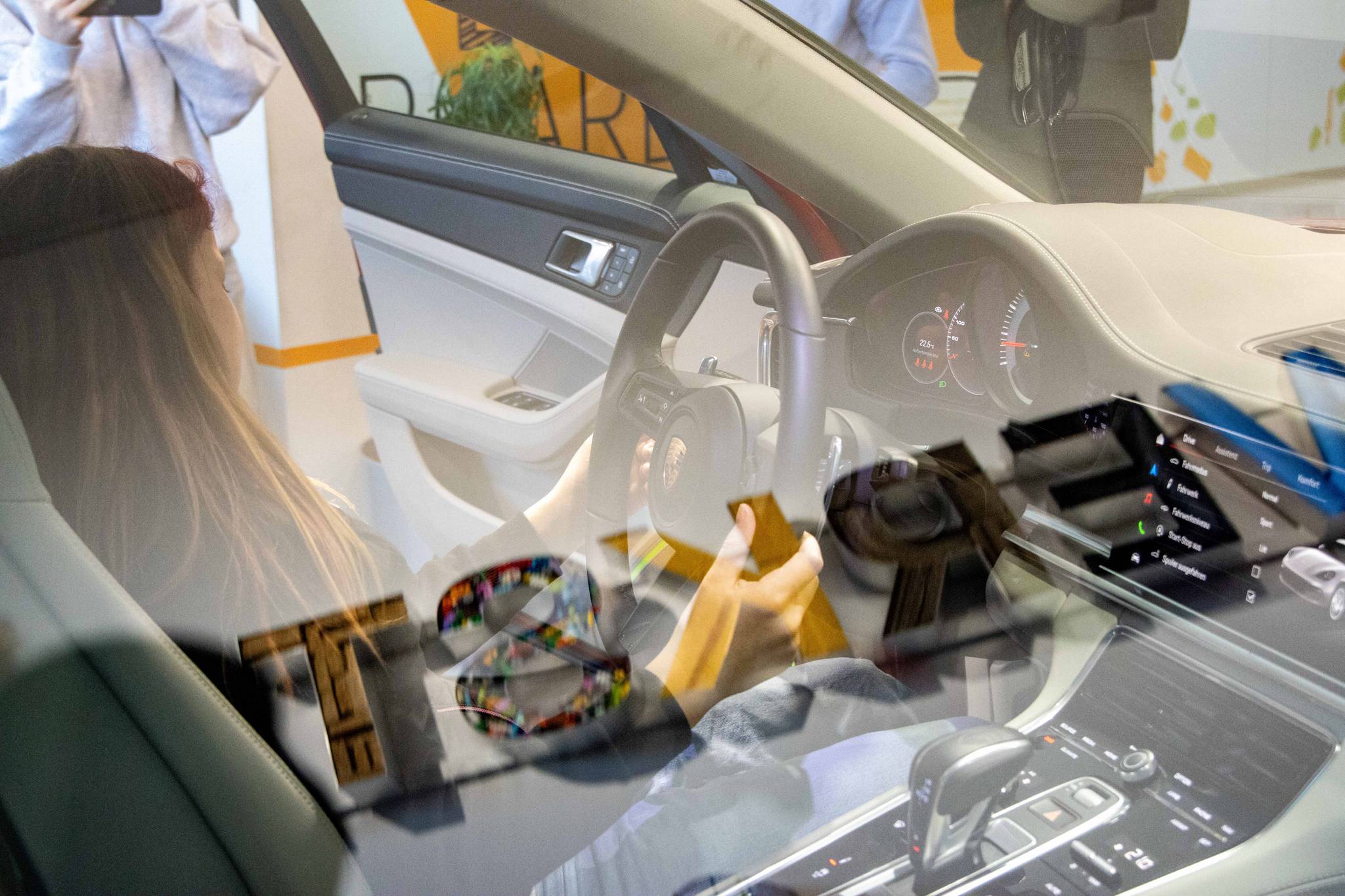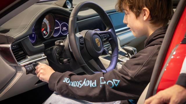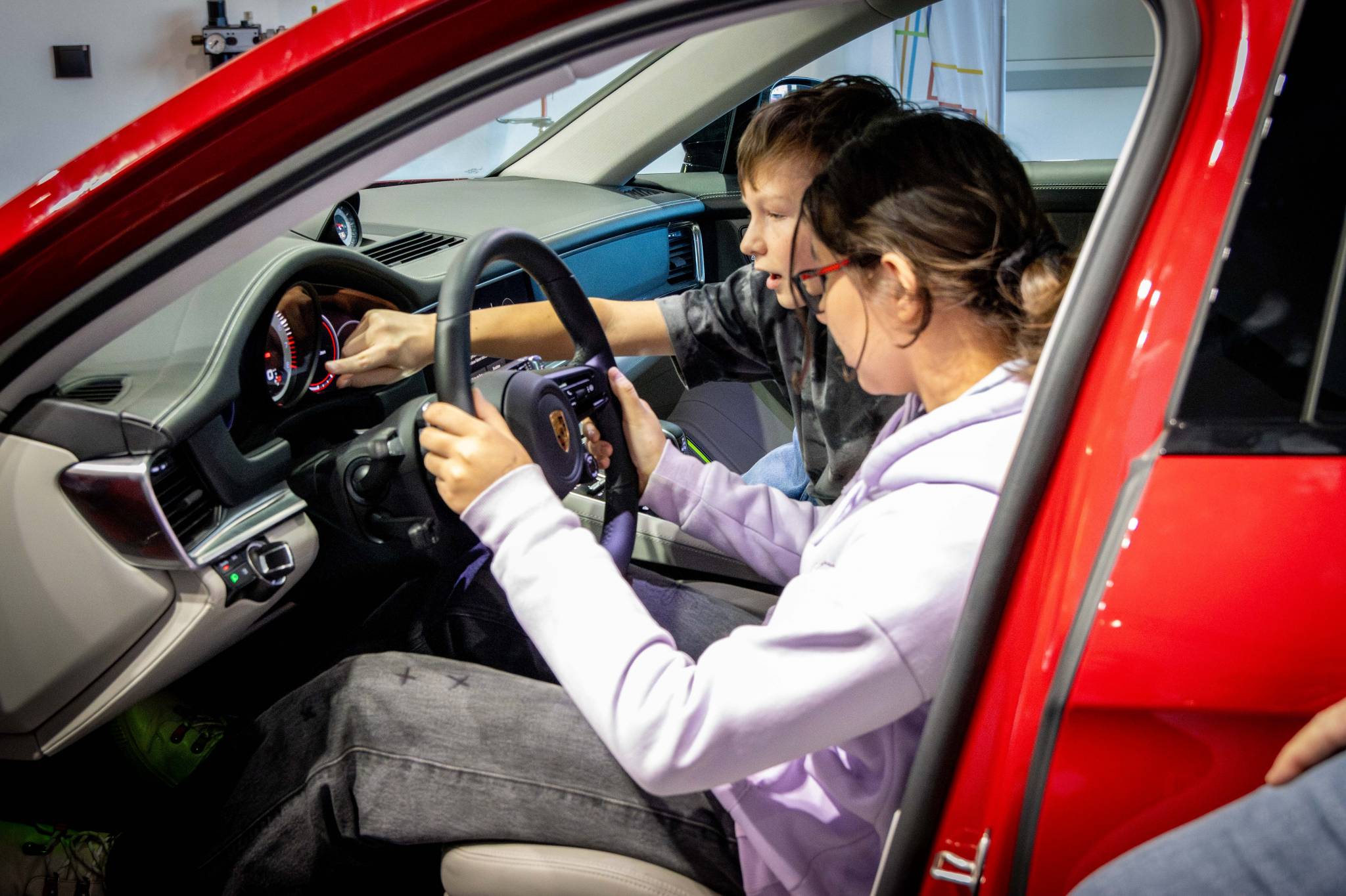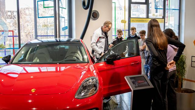 Nach der intensiven Arbeit an den Modellen wartete eine besondere Überraschung auf die Gruppe: Zum Abschluss des Mobilitäts-Workshops durften die Schülerinnen und Schüler in einem echten Porsche Platz nehmen. Das Einschalten des Wagens und das Aufheulen des Motors sorgten für strahlende Gesichter und einen unvergesslichen Moment.