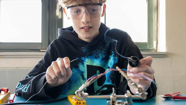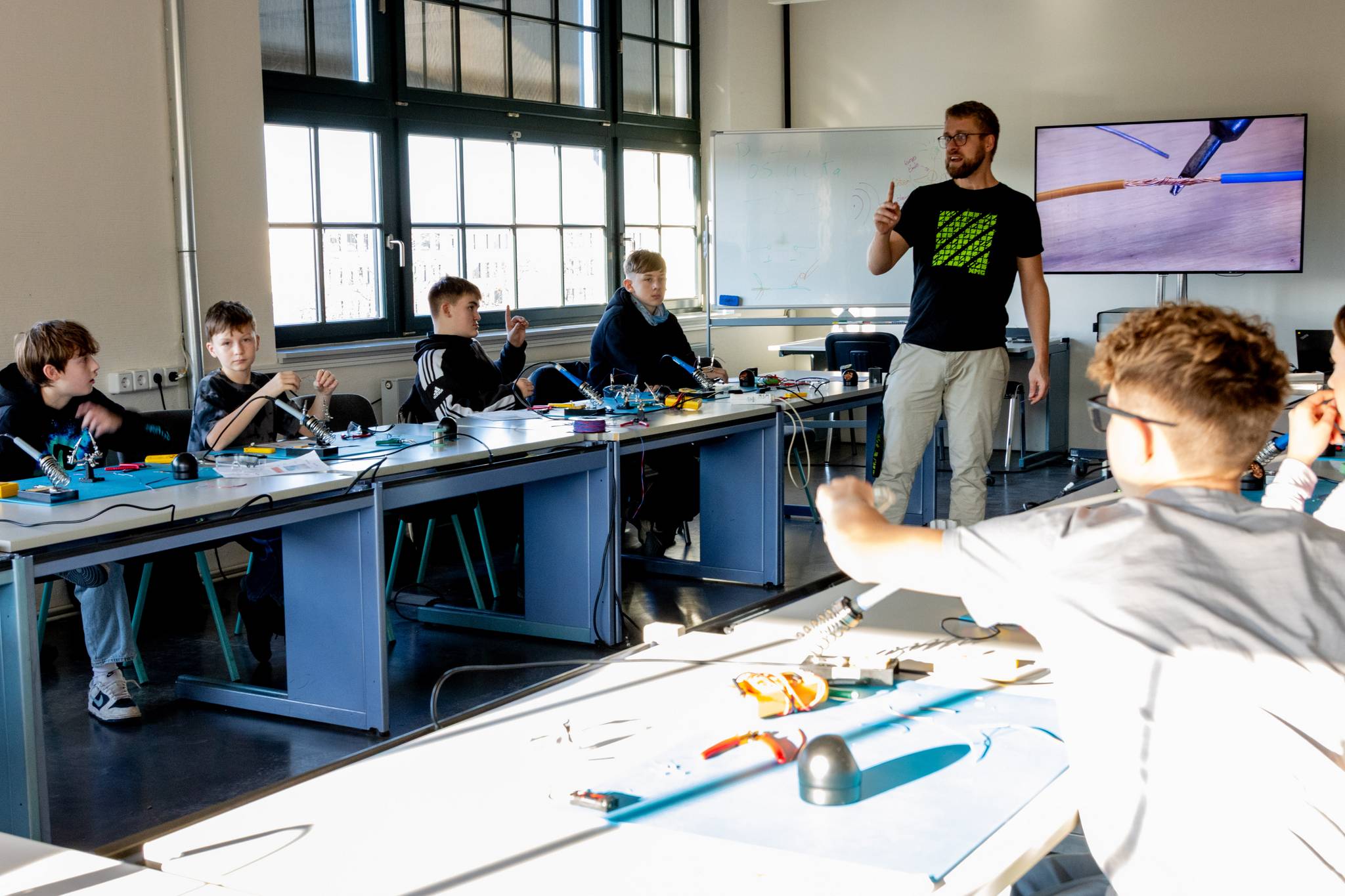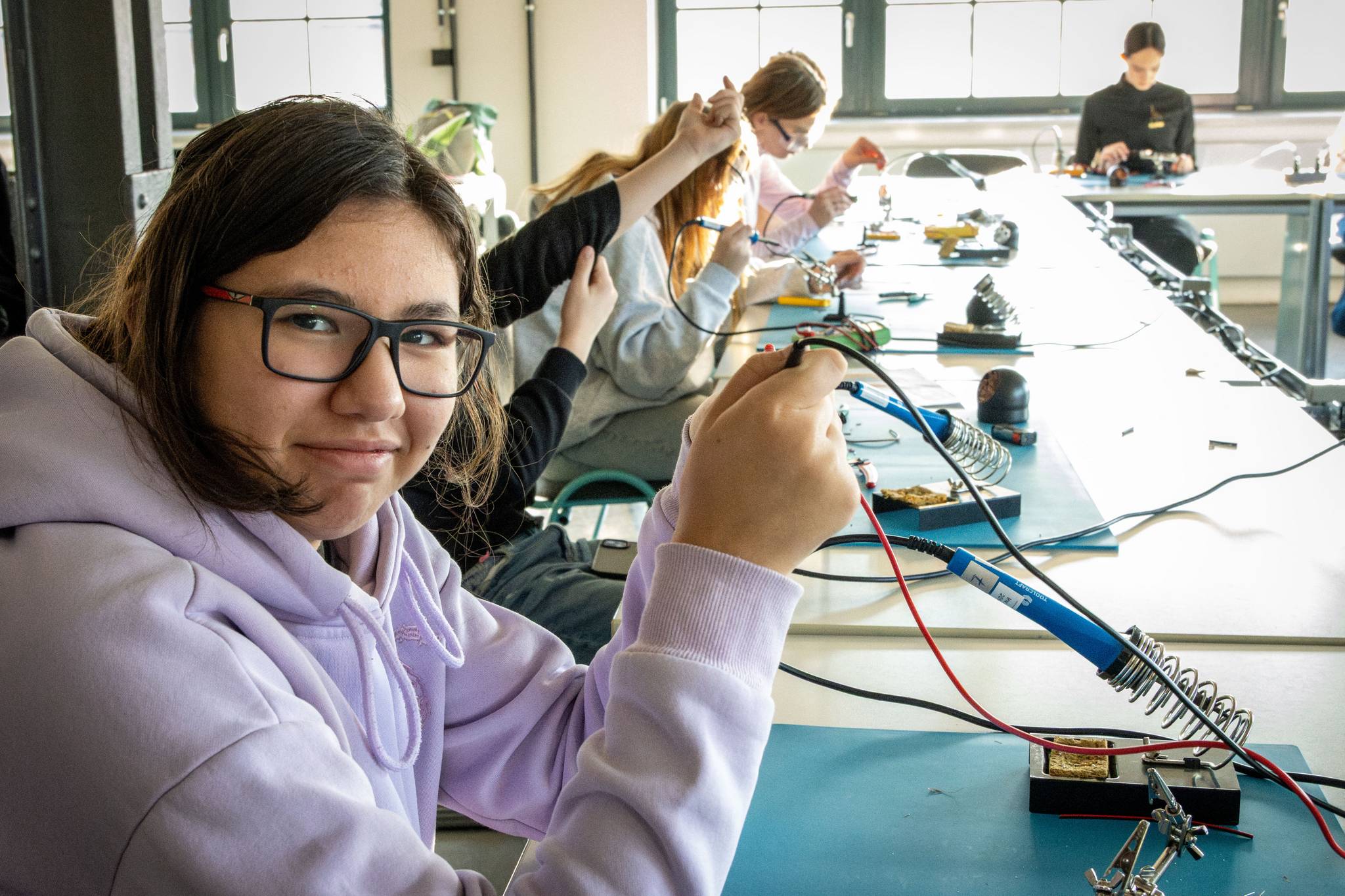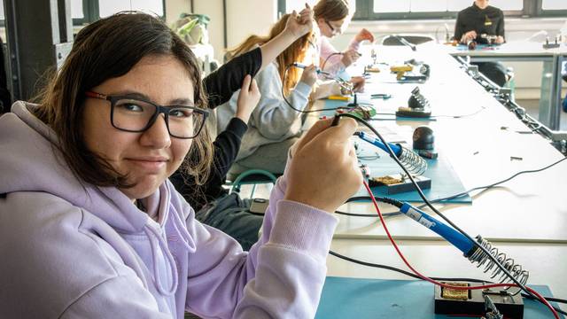 Weichlöten – Ein „Must-have-Skill“: Hier wurde es heiß! Die Klasse lernte den Umgang mit dem Lötkolben, um stabile elektrische Verbindungen herzustellen. Ob Drähte oder LED-Leuchten mit Widerstand – das Fertigen eigener Schaltungen zeigte eindrucksvoll, wie moderne Elektronik im Kern funktioniert.