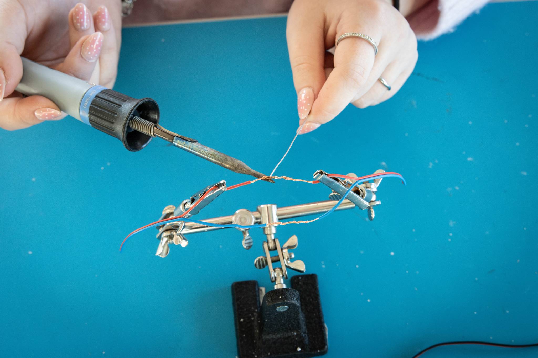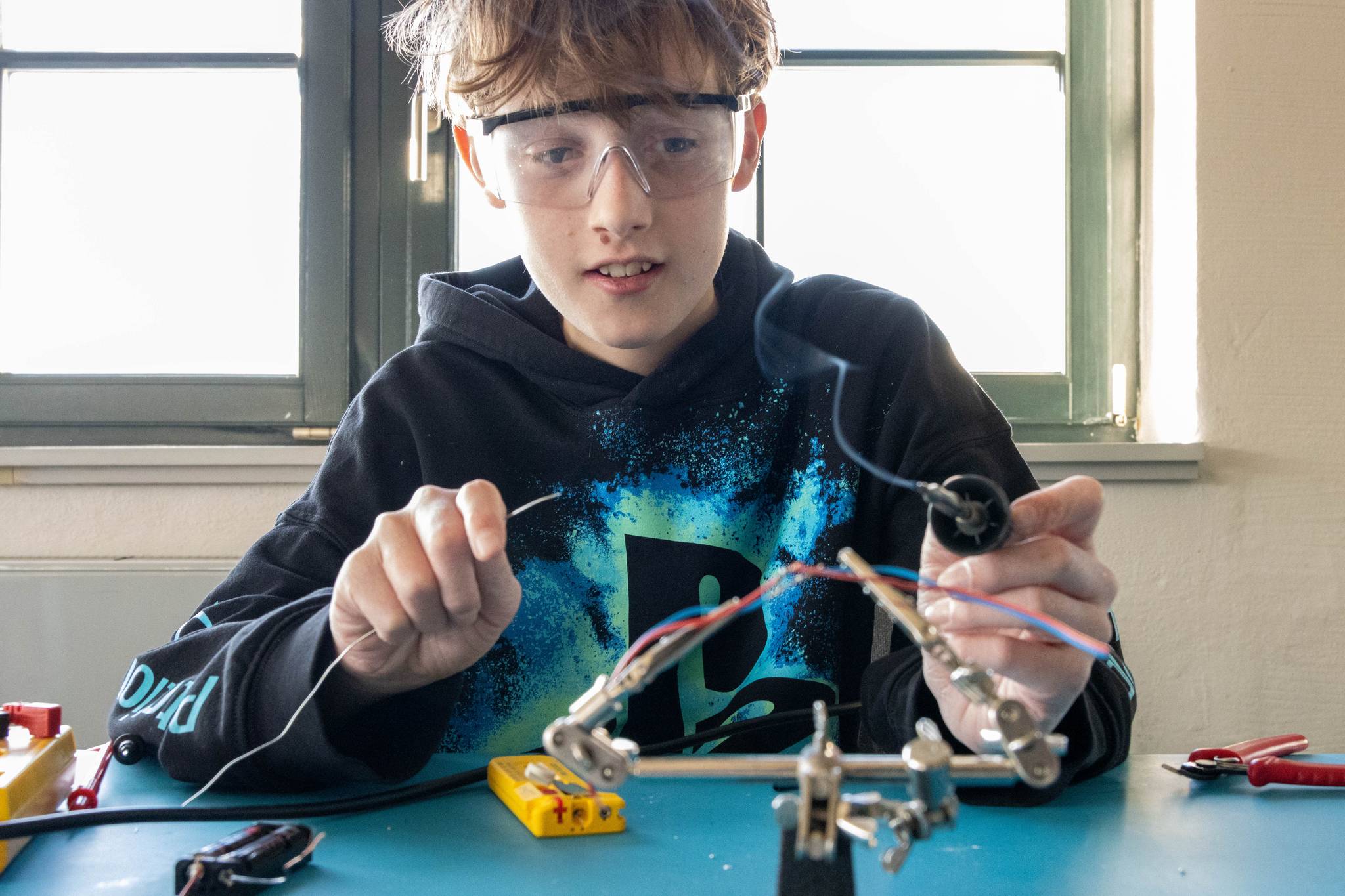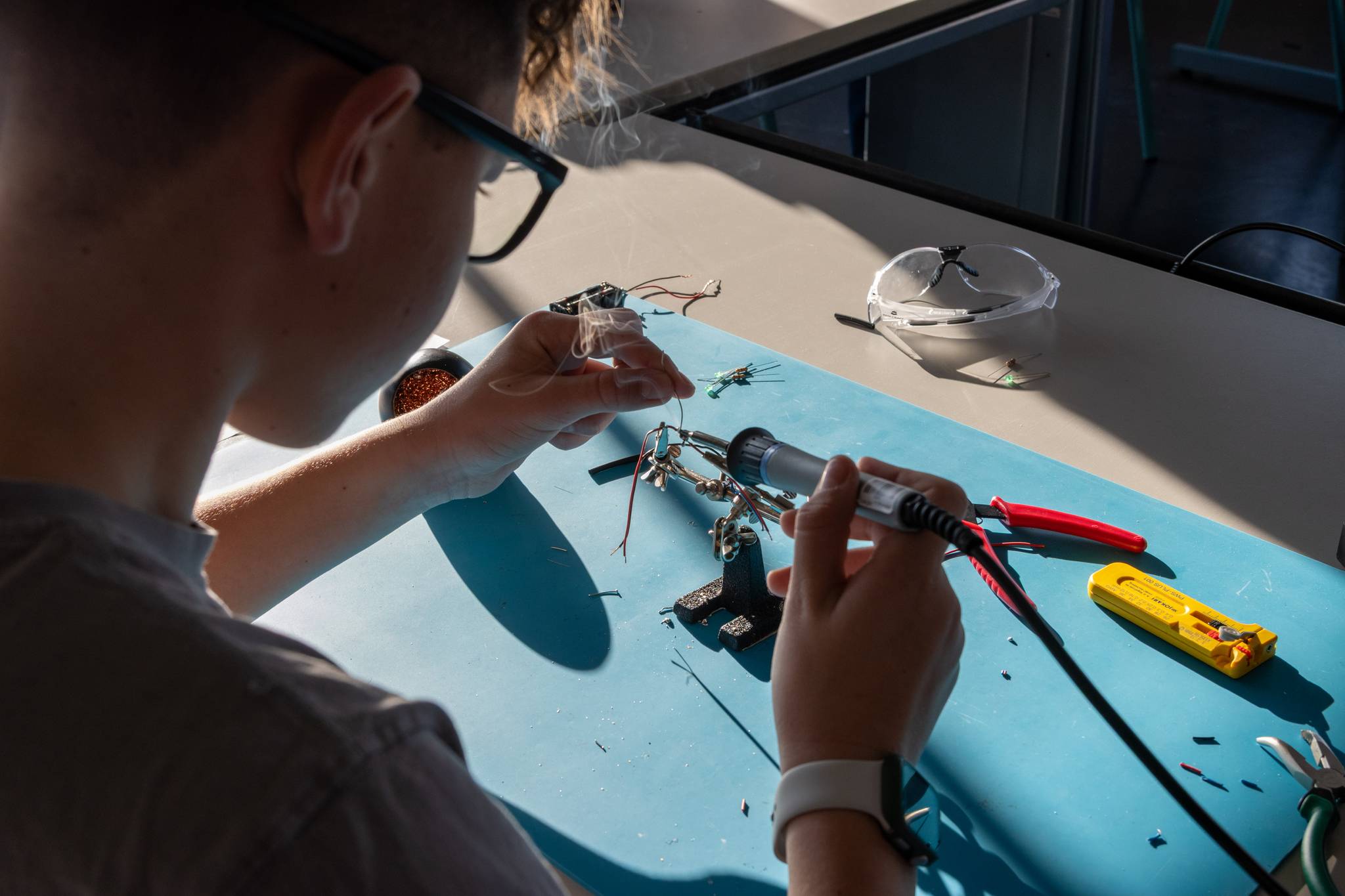 Weichlöten – Ein „Must-have-Skill“: Hier wurde es heiß! Die Klasse lernte den Umgang mit dem Lötkolben, um stabile elektrische Verbindungen herzustellen. Ob Drähte oder LED-Leuchten mit Widerstand – das Fertigen eigener Schaltungen zeigte eindrucksvoll, wie moderne Elektronik im Kern funktioniert.