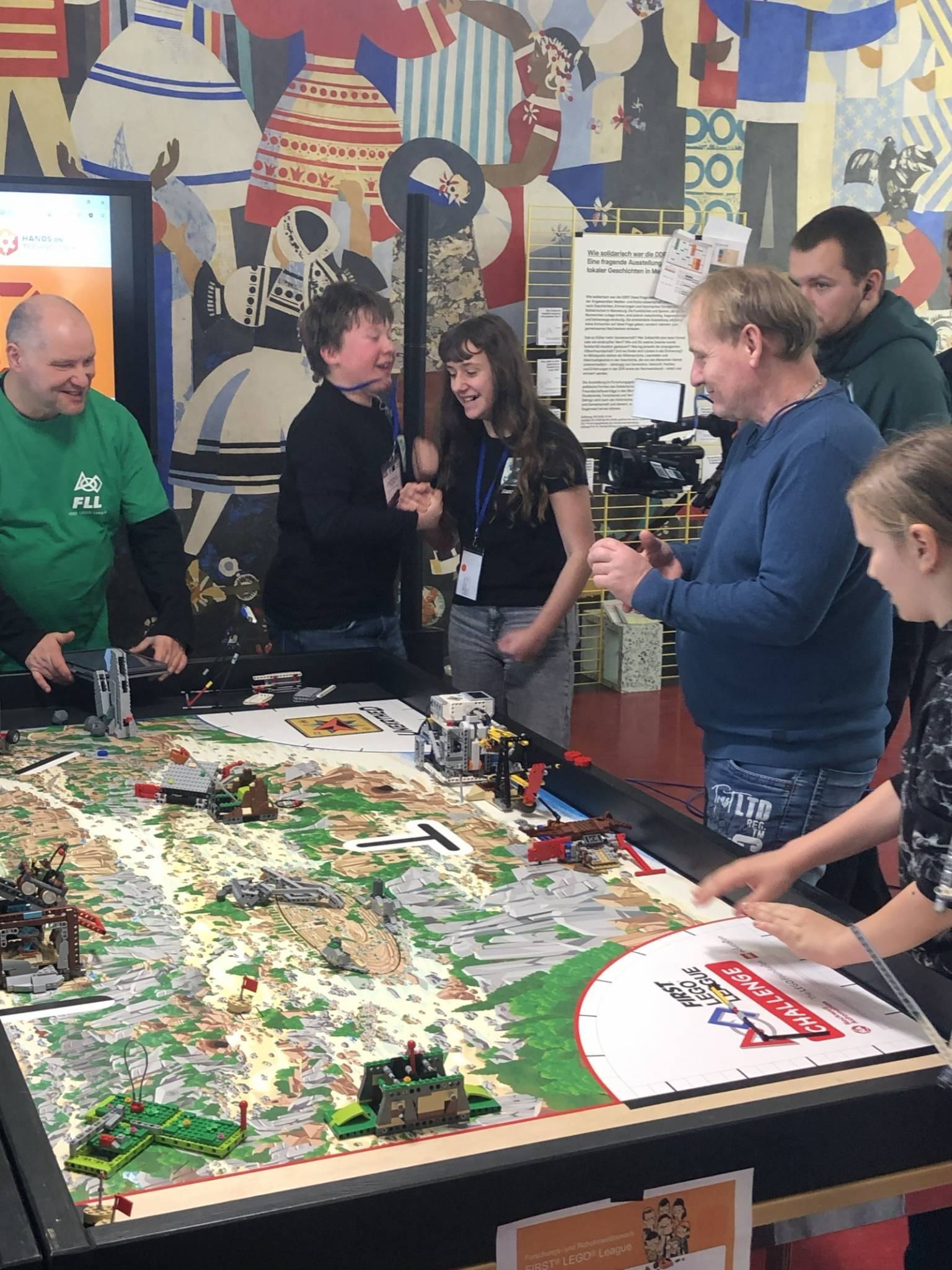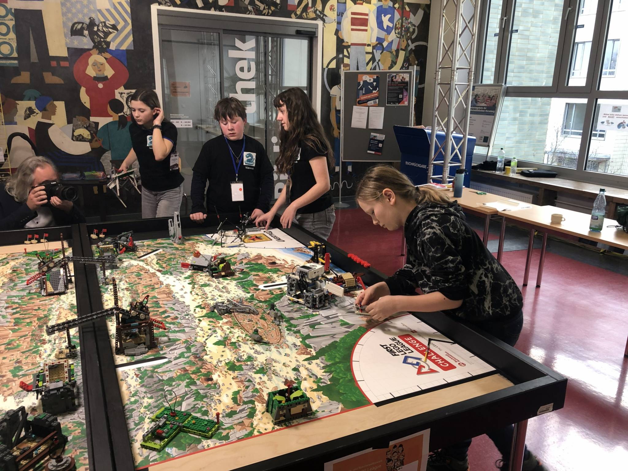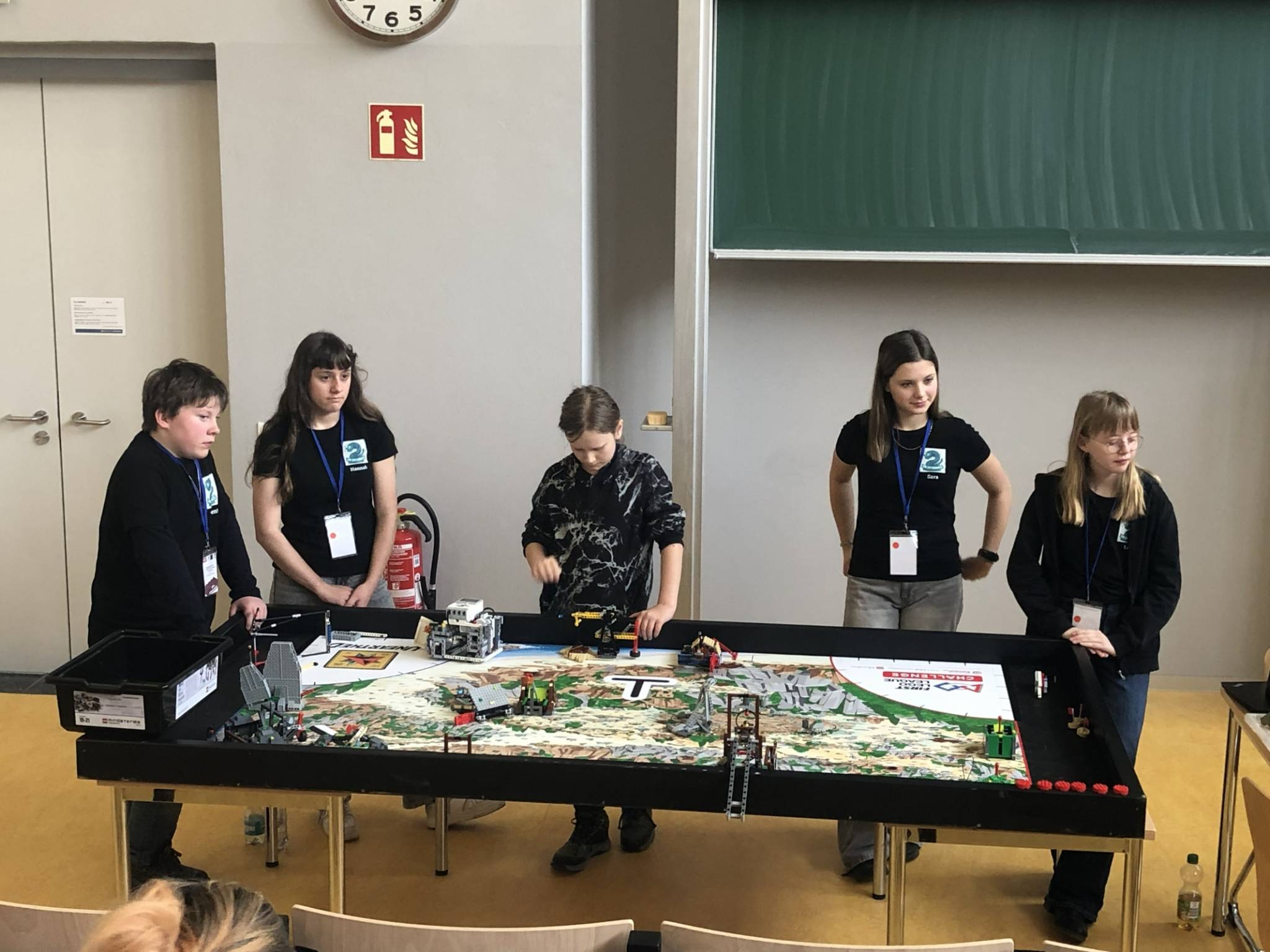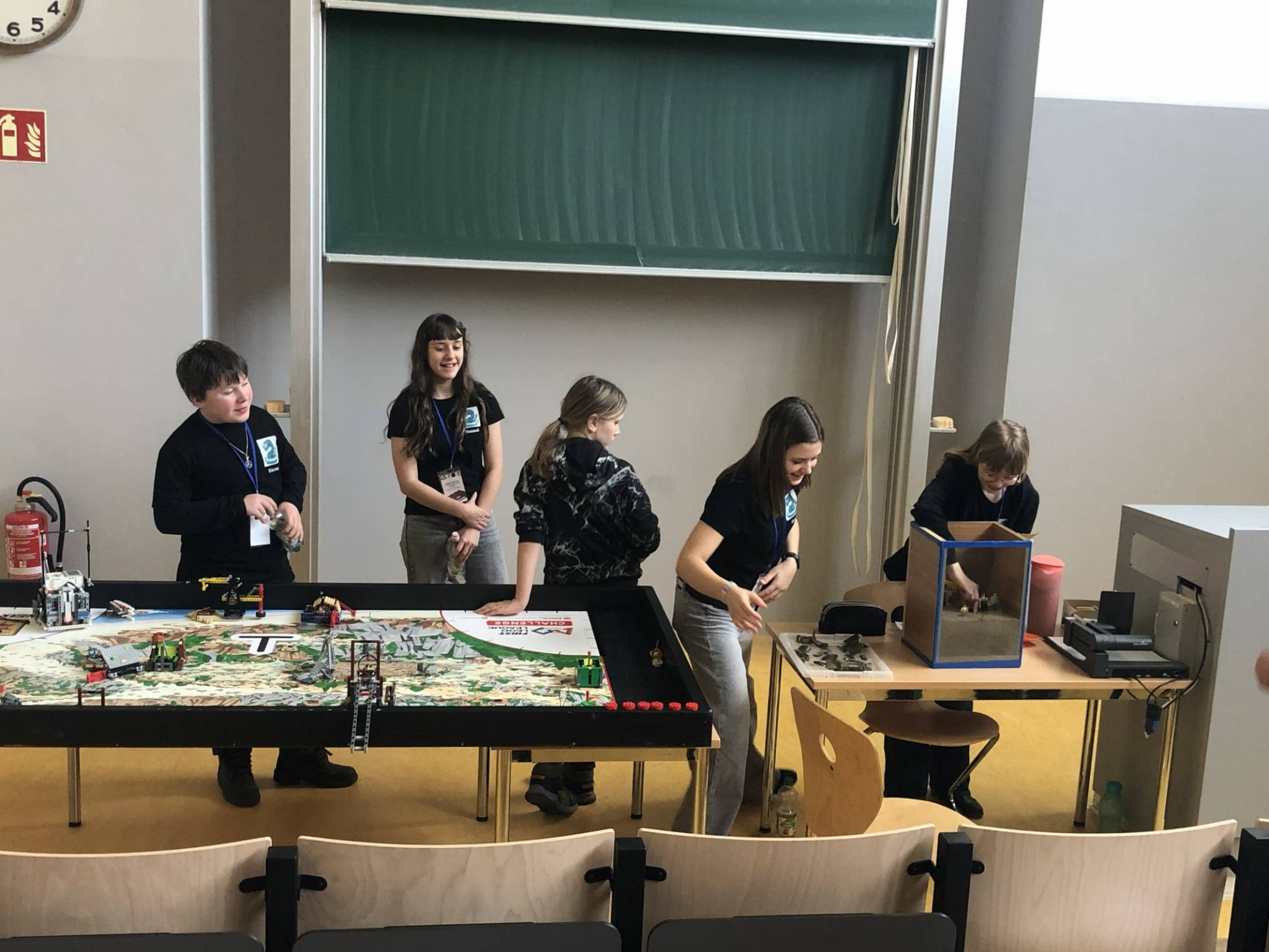 Als kleinstes und insgesamt jüngstes Team – alle Schülerinnen und Schüler gehen in die 6. Klasse – traten wir in verschiedenen Disziplinen gegen insgesamt 10 andere Teams im FLL-„Challenge“-Wettbewerb an. Zum diesjährigen Thema „Archäologie“ galt es, kniffelige Aufgaben mit einem zuvor gebauten und programmierten, autonom fahrenden LEGO-Roboter zu lösen, aber auch in einem Vortrag die Professoren der Hochschule davon zu überzeugen, dass man sich mit dem Thema Archäologie auseinandergesetzt hatte. In vielen Stunden hatten sich die Schüler des Teams mit dem Programmieren und Bauen des Roboters befasst, hatten ein Modell einer Ausgrabungsstätte gebaut und selbst eine archäologische Grabung durchgeführt. Am Ende durften sie sich über eine Anerkennung in der Disziplin „Roboterdesign“ und einen zweiten Platz in der Hauptdisziplin „Roboterwettkampf“ freuen – eine hervorragende Leistung im Wettkampf gegen viele ältere und erfahrenere Teams.